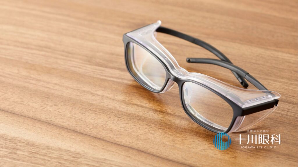 通常のメガネに似た形状で、サイドに保護シールドが付いたものです。日常生活での着用に違和感が少なく、外出時にも目立ちにくいのが特徴です。